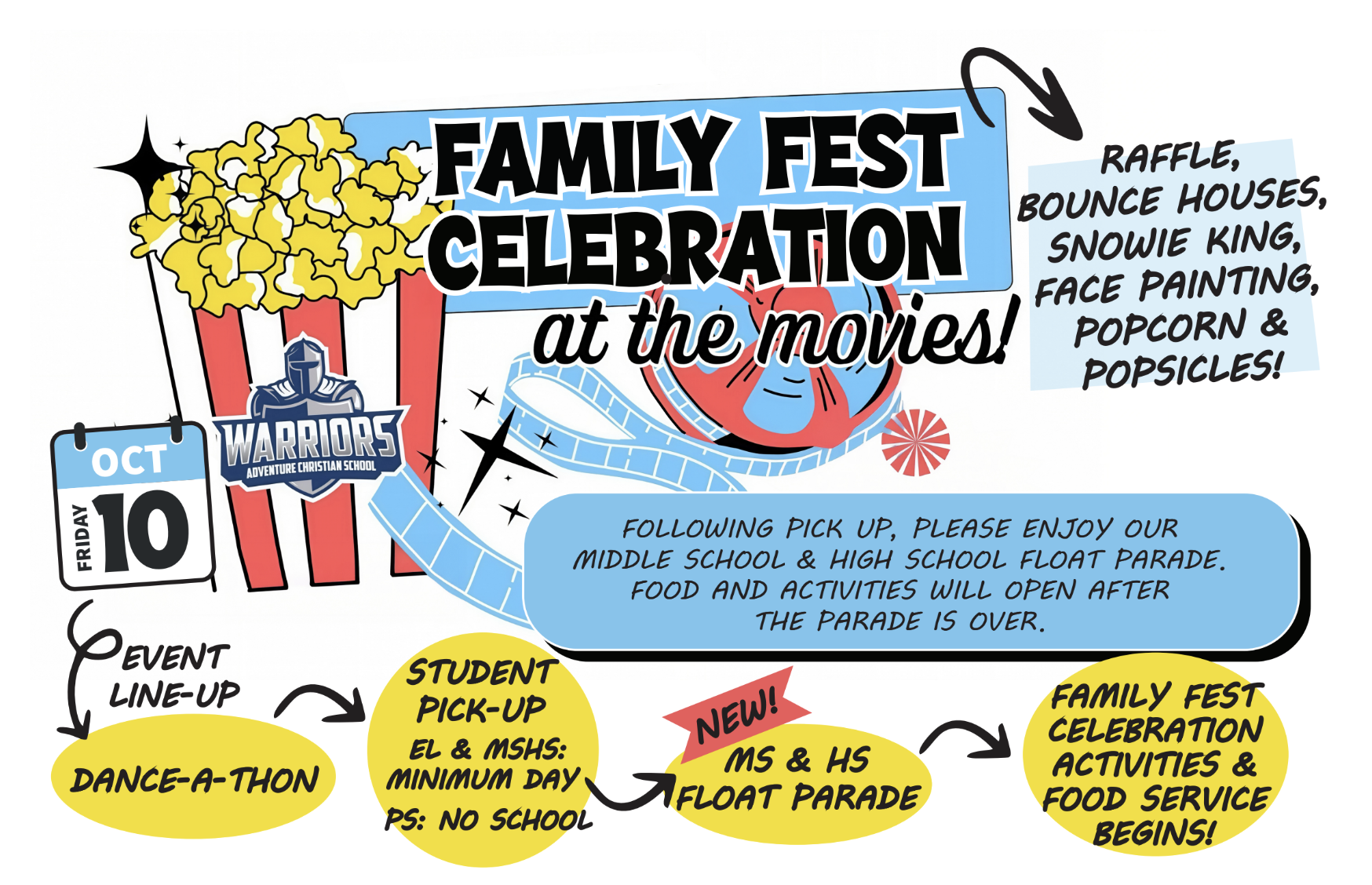 To celebrate the day’s festivities, we would like everyone to join us immediately following Dance-a-thon for our Homecoming Parade followed by our Family Fest, a time for our school families to join together for fun and fellowship with bouncehouses, dunk tanks, raffles, and free food provided by Salvation Army!